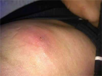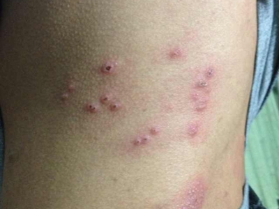 体虱病患者腰部皮肤形成较大的红疙瘩,皮损处皮肤发红、肿胀,随病情发展疙瘩内部化脓感染,在结节顶端形成脓疱,脓疱破溃后结痂,形成黄褐色痂皮。