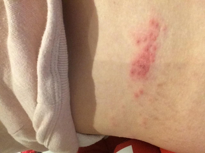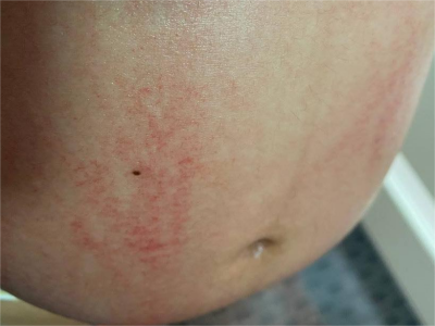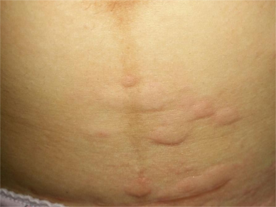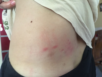 体虱病患者腰部出现多个红色丘疹,大小不等,伴有剧烈瘙痒,患者在感到瘙痒后抓挠,在皮肤表面形成淡粉色抓痕,在停止抓挠后逐渐消失。