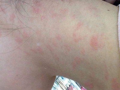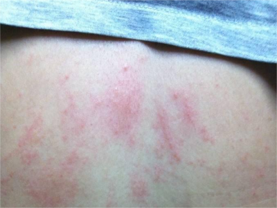 体虱病患者背部出现片状红斑,无特定的形状,而且表面会出现细小的凸起,摸上去感觉较粗糙,也可以出现一条条线状抓痕,多是由于患者用力搔抓引起。
