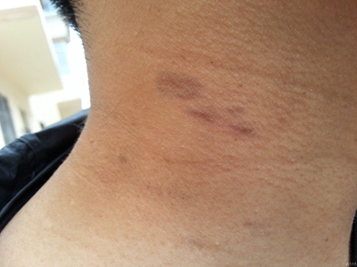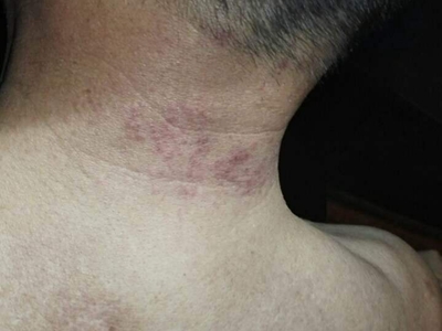 体虱病患者侧颈部皮肤颜色加重,呈棕褐色样的色素沉着,边缘不规则,并伴随小红疙瘩。多是由于皮肤自我修复后色素遗留导致,患者无自觉症状。