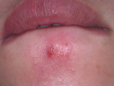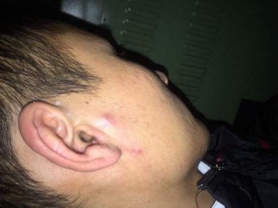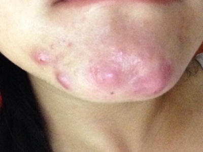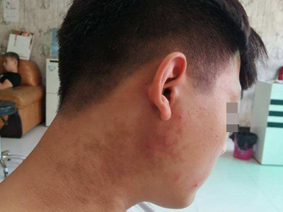 体虱病患者下巴长出大小不等的大红疙瘩,部分疙瘩已融合,质地较硬,触摸时有明显疼痛感。局部顶端化脓,脓疱破溃后结痂,形成深红色瘢痕。