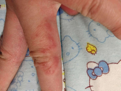 体虱病患者手背出现一片黄白色的痂,痂片较薄,表面裂开。边缘散在类圆形、针尖形的小水疱,看上去呈透明颜色,不会相互聚集融合,触摸时会出现粗糙颗粒感。