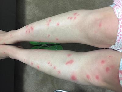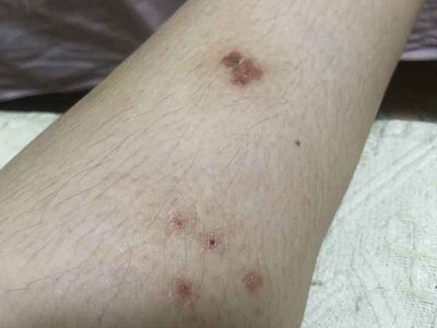体虱病可出现在四肢远端,如脚踝部位,叮蜇后出现发痒的红色丘疹和风团,绿豆至黄豆大小,因局部瘙痒严重,患者常用指甲去搔抓,从而在皮损顶端形成血痂。