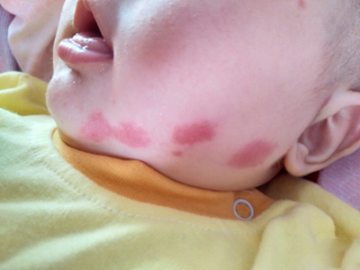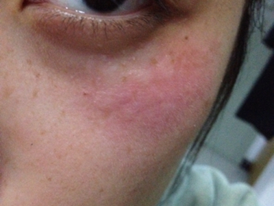 体虱病累及患者面部,导致局部出现多个红色斑片,硬币大小,边缘清晰,大小不等,可以相互融合。患者有瘙痒感,随疾病进展,红斑会逐渐增大。