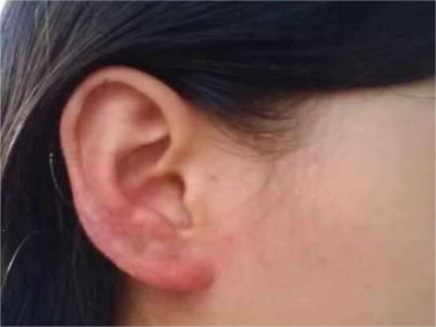 体虱病患者耳朵部位皮肤受到叮咬后发红、肿胀,伴有剧烈瘙痒,抓挠后局部受损,有红色加深、皮肤脱屑等症状出现。同时患者耳部有灼烧感,局部皮温升高。