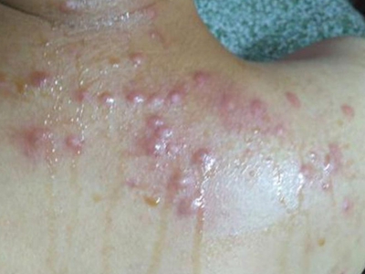 体虱病患者背部上方出现类圆形的红色小脓疱,为绿豆大小,呈聚集分布但互相不融合,周边合并红斑,颜色与脓疱相比较轻,过度摩擦时会使脓疱破裂,而出现渗液、出血。