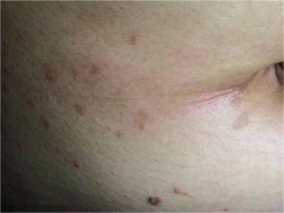 体虱病患者腹部左侧的小疙瘩结褐色痂片,与原先一样散在分布,痂片体积较小,周围伴随颜色较浅的红斑,多是由于小疙瘩破损出血,变干引起。