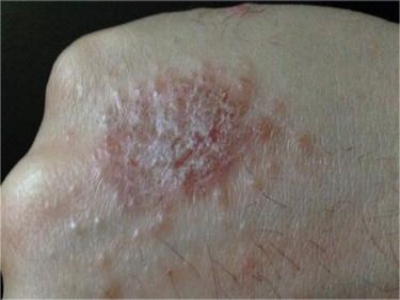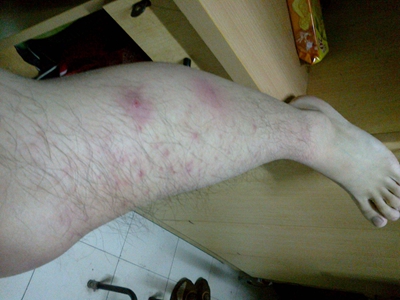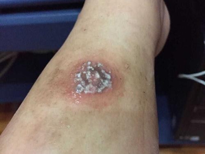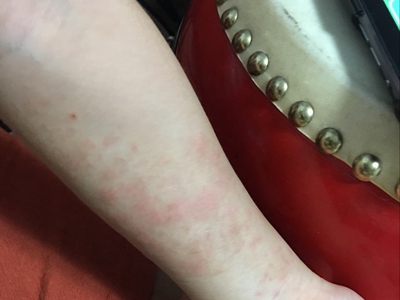 体虱病患者小腿出现类圆形、不规则形的红色斑块,大小不一,边缘境界不清,抚摸局部时可以感到凸起样粗糙,表面会出现破皮现象,而且患者会自觉瘙痒。