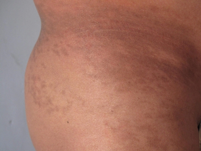 体虱病患者腹部右侧出现不规则的褐色色素沉着,与周围正常皮肤分界清晰,局部皮肤粗糙,患者无异常瘙痒、疼痛等症状。