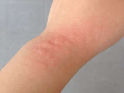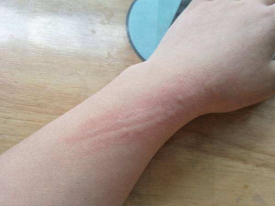 体虱病导致患者手腕周围两条带状的风团,宽度较窄,略凸起于正常皮肤,风团表面颜色发白,周围皮肤颜色发红,多是由于患者过度搔抓引起。