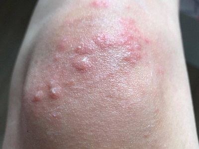 体虱病患者膝盖处有多个红色丘疹,质地较硬,大小不等,可以相互融合。部分丘疹顶端有白色脓头,周围皮肤泛红,同时伴有瘙痒症状。