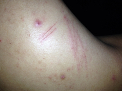体虱病患者大腿会出现相互交叉的线条状皮下出血点,周围合并红晕,也会出现顶端破损出血的情况,多是由于过度搔抓引起,触摸时会感到明显刺痛。
