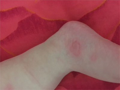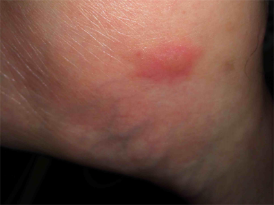 体虱病患者脚踝出现形态不规则的红斑,表面皮肤纹路较重,边缘与周边皮肤之间有一圈颜色较重的线相隔,周围伴随红晕,若不及时治疗会进一步出血感染。