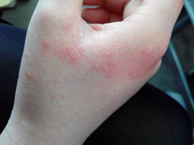 体虱病患者手背部出现片状形态不规则的红斑,周围围绕红晕,上方有针尖样小丘疹,触摸时可以感到粗糙,若不及时治疗,局部红斑会相互融合,形成大片红斑。