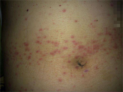 体虱病累及患者下腹部,表现为局部出现散在淡红色或肉色疙瘩,明显凸起于皮肤表面,大小不一,并呈聚集性分布,距离较近的疙瘩可以相互融合。