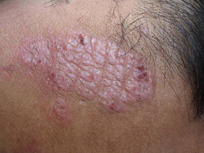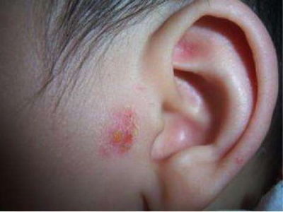 体虱病患者耳朵前方有红色丘疹,融合成片,后化脓破溃,局部皮肤缺损,露出内部红色皮下组织,同时有液体渗出,干涸后凝固为黄色痂皮。