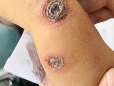 体虱病累及患者胳膊,导致局部出现类圆形结痂,大小与早期皮损一致,表现为灰白色,中间会明显凹陷,边缘围绕一圈红晕,并伴随少量黄痂,是由于脓液变干引起。