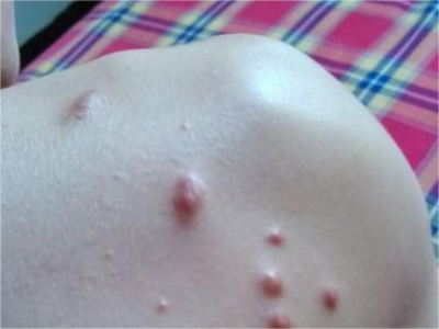 体虱病患者肩部有多处红色疙瘩,大小不等,边缘清晰,质地较硬,疙瘩表面紧实有光泽,互相之间没有融合。患者触摸时有瘙痒或疼痛感。
