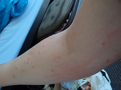 体虱病患者胳膊上方出现不规则形状、淡红色斑片,可以散在分布。随着病情的发展,红斑数量逐渐增多,并相互聚集,使皮损面积增大。