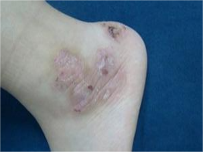 体虱病患者脚踝侧方出现不规则样红斑,整体面积较大,中间可以出现脱白皮现象,使局部颜色相对较轻,边缘颜色较暗,像色素沉着,而且也会结小痂。