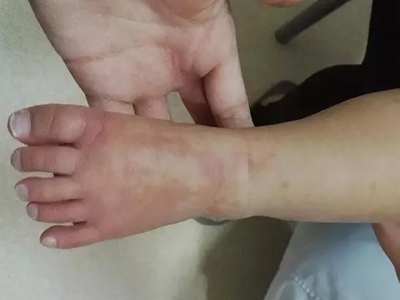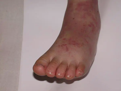 川崎病患者脚趾及脚背有肿胀表现,表皮紧绷,脚背局部还有不规则的红斑,且脚趾及脚踝的活动度受到一定的影响,严重时可影响行走功能。