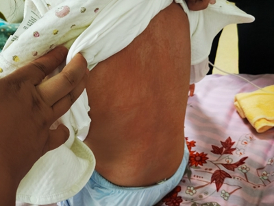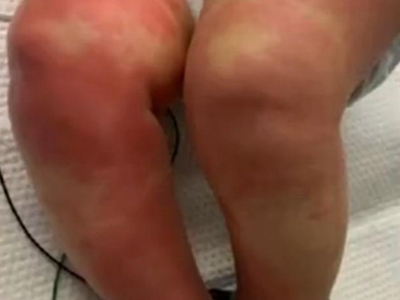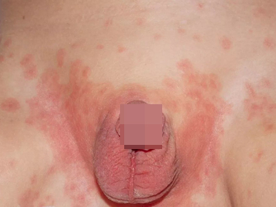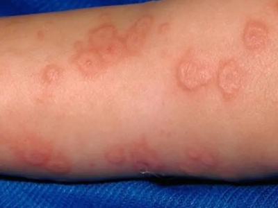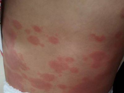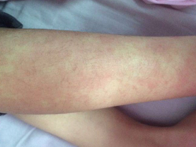 川崎病患者大腿出现数十个红斑,皮疹多呈环形,中央凹陷,边缘隆起,周围有红色晕环,直径有5mm左右,部分会融合症片,还可以伴随有瘙痒感。