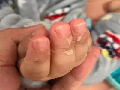 川崎病儿童左手手指尖皮肤脱皮严重,翘起大块白皮,手指甲甲板有多处翘起,凹凸图不平,触感粗糙,伴有褐色斑点。其发生的病因尚不清楚,可能与感染、免疫等因素有关。