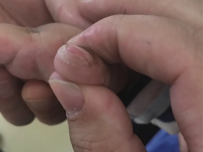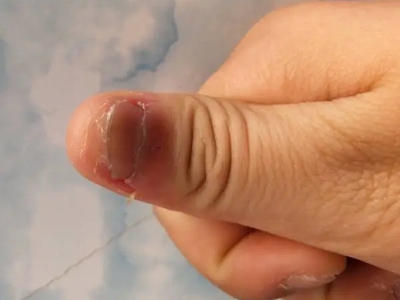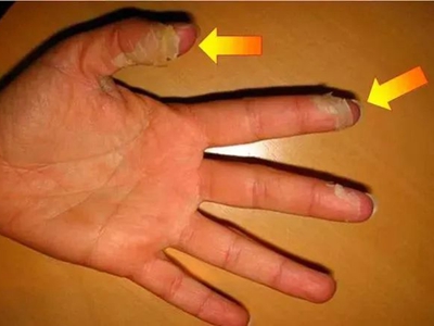 川崎病右手大拇指指端靠近指甲部位的皮肤有脱皮现象,手指甲甲板后退1/2,病情继续发展,情况严重时,指甲可能出现全部脱落等情况。