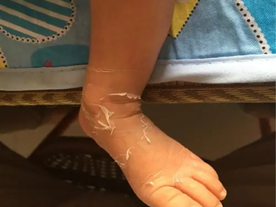 川崎病患者脚踝出现大片脱皮,呈现为白色薄膜状,暴露的皮肤无红肿、溃疡,并且在小腿处有白色的的干燥裂纹,撕拉表皮无疼痛等不适症状。