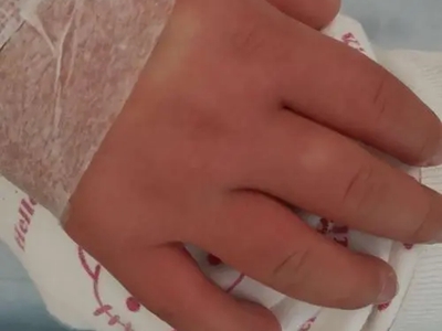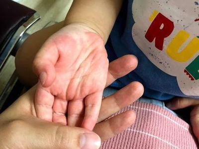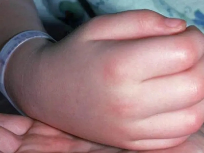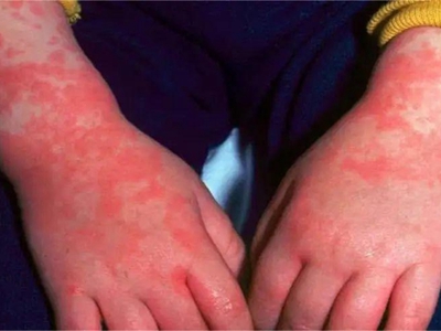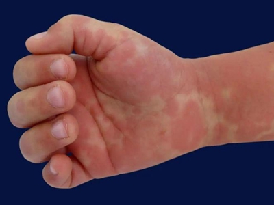 川崎病患者手背出现密密麻麻的红斑,且延伸至手臂和手指缝,呈猩红热样改变,皮疹压之褪色,部分皮疹相互融合成大片,形态不规则。
