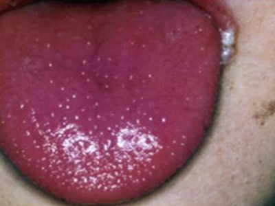 川崎病病损侵犯舌头时,表现为舌头表面许多突起的小红疙瘩,呈圆形,针尖至粟粒大小不等,边界清楚,部分皮损散在分布,舌尖部皮疹密集分布。
