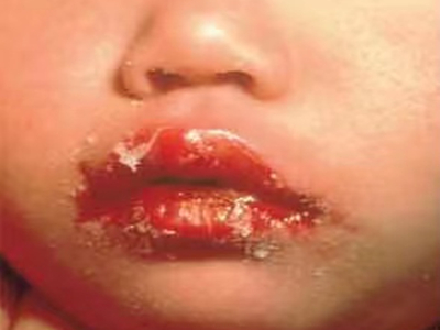 川崎病发病后,患儿在疾病的急性期嘴唇会出现发红、干裂、起皮等病理变化,张嘴困难,嘴角处撕裂结痂,同时伴有高烧不退、淋巴结肿大等临床症状。