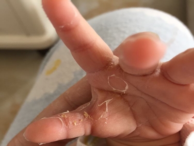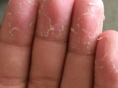 川崎病患者手指开始出现膜状脱皮,形状不规则,边缘有白色的脱屑,部分蜷缩翘起,触摸时有粗糙感,随疾病发展,会逐渐扩展至整个手掌。