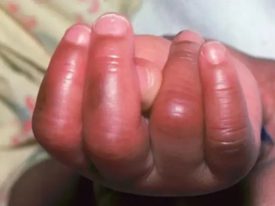 川崎病患者手背、手掌及手指明显发红,呈发面馒头样肿大,指间关节褶皱变浅甚至消失,随疾病逐渐发展,后期手部会出现片状脱皮现象。