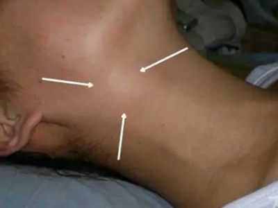 川崎病患者左侧脖子出现一个圆形肿块,边界清楚,如鹌鹑蛋大小,与周围皮肤无粘连,表面光滑,触之较硬,按压时可出现疼痛症状。