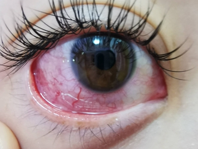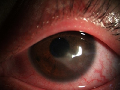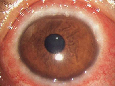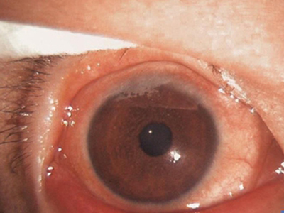 患者角膜可受累及,常表现为弥漫性点状上皮角膜炎,甚至形成盾形无菌性上皮缺损。部分患者急性期可在角膜缘见到白色Horner-Trantas结节,角膜上方有微小血管翳、上睑下垂等。本病可反复发作,持续2-10年,成年后逐渐消失。