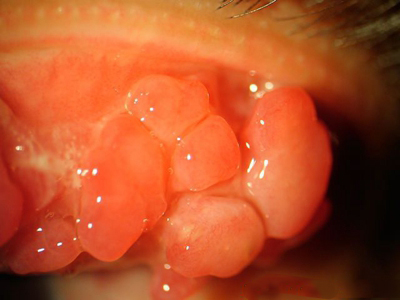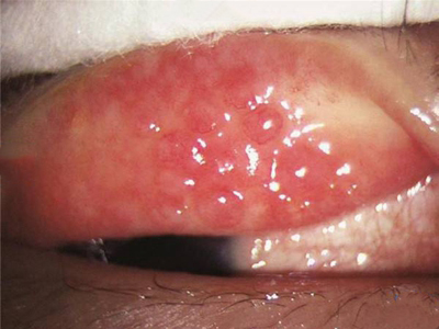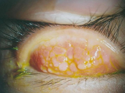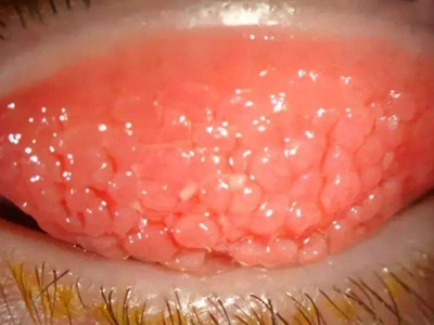 1、睑结膜型:睑结膜呈粉红色,上睑结膜巨大乳头呈铺路石样排列,形状不一,扁平外观,炎症静止后结膜乳头完全消退,不遗留瘢痕。