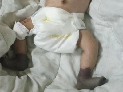 坏疽性蜂窝织炎患儿的双足呈现为黑色,提示发生了坏死,可逐渐向小腿蔓延,需要及时进行治疗,需积极治疗原发病,纠正营养不良,全身应用敏感抗生素。