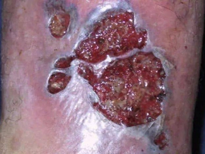 坏疽性蜂窝织炎病情发展较为严重时,患者腿部出现形状不规则、数量不等的溃疡,溃疡面凹陷呈鲜红色,表面覆有渗液和脓液,周围皮肤呈光滑的红斑样。