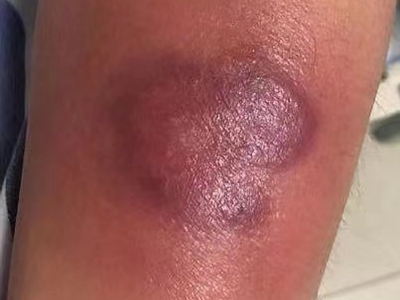 此时触诊皮肤有漂浮感,若脓液较多,则有波动感。随后皮肤呈紫黑色坏死,可腐脱。部分患儿病损区域可出现多个水疱、血疱或脓疱,或可互相融合。