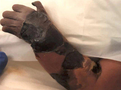坏疽性蜂窝织炎患者的手背和胳膊出现坏死,局部皮肤萎缩干硬,呈黑色焦痂样,手指也已经变色,呈灰黑色,提示缺乏血液循环,也已经坏死。
