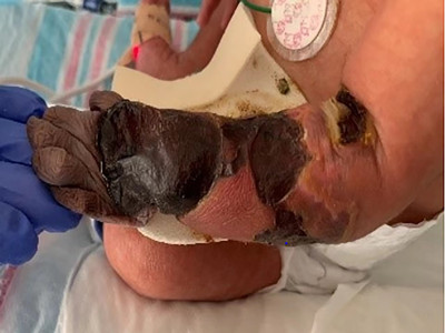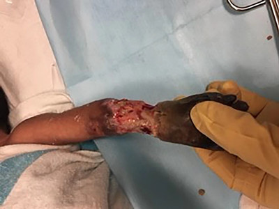 坏疽性蜂窝织炎严重患儿手部发黑坏死,手腕和部分手臂已经糜烂,创面只剩下腐烂的肌肉等组织以及骨骼,需要及时控制感染,挽救患儿生命。