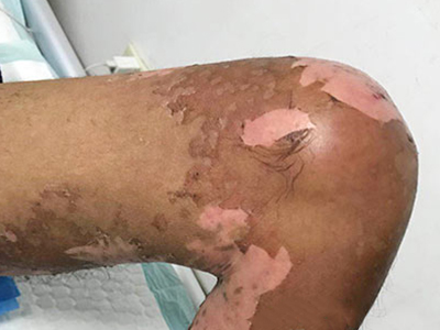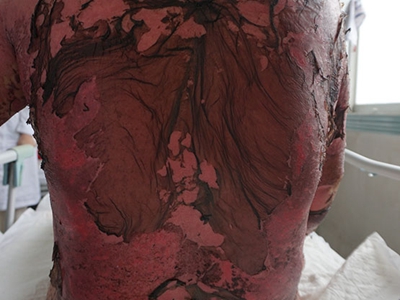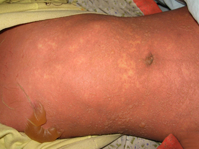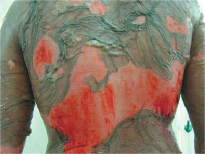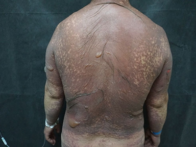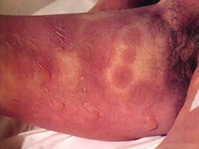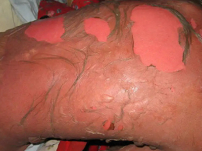 随即出现大小不等的松弛性水疱,呈广泛表皮松解,伴有疼痛或烧灼感。发展迅速,很快遍及全身。还可累及黏膜受累、脏器受累,引起心、肝、肾损害。少数可累及肺及脑部,出现肺出血、脑出血。