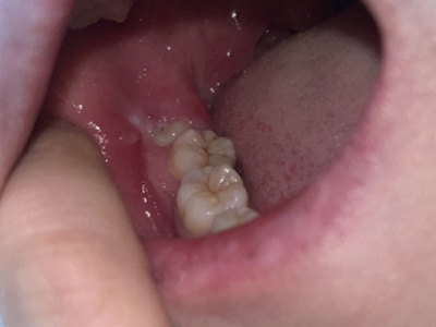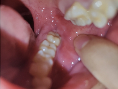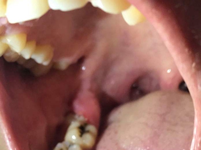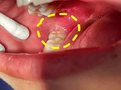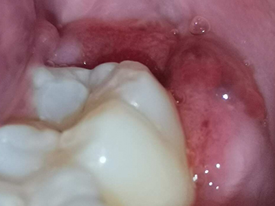 患有智齿冠周炎的左侧下方智齿旁牙龈有一个大肿块,肿块表面发红且光滑紧绷,呈圆球形隆起,覆盖部分牙冠,同时智齿与旁边牙龈边缘稍有分离。