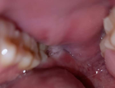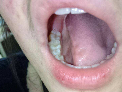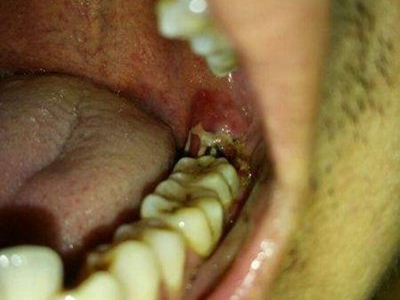 智齿冠周炎挨着嗓子的牙龈处溃烂发白图