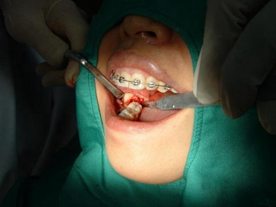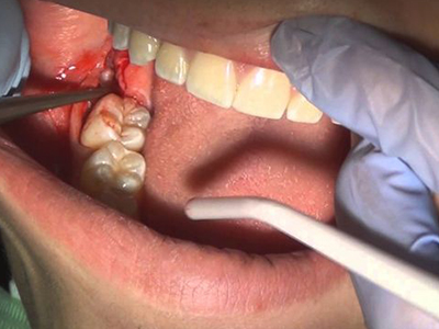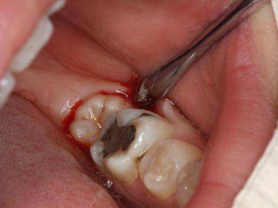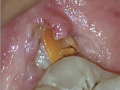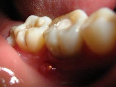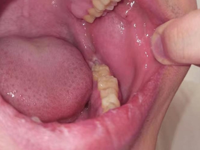 发生智齿冠周炎的智齿后方牙龈明显增生,并覆盖在牙齿表面,同时发生化脓,局部有黄白色脓性渗出物流出,牙龈表面有少量白膜覆盖。
