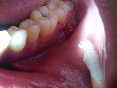 智齿冠周炎患者口腔右下方智齿的牙龈处有一小疙瘩,小疙瘩表面红肿,边缘微微发白,可见少量的牙齿萌出,周围黏膜有明显的充血、发红样。
