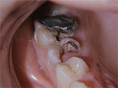 智齿冠周炎患者可出现第二磨牙龋坏变黑,是由于智齿倾斜阻生,与第二磨牙之间形成间隙,间隙不易清洁,食物和细菌积存,长此以往可导致牙齿龋坏发黑甚至出现缺损。