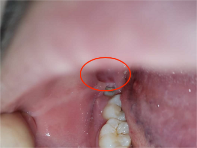 智齿冠周炎患者右下方的牙龈最内侧有红肿,红肿处有一小创口,可见其内的牙齿,牙齿未完整露出,小创口边缘微微发白,患者自觉有明显疼痛。
