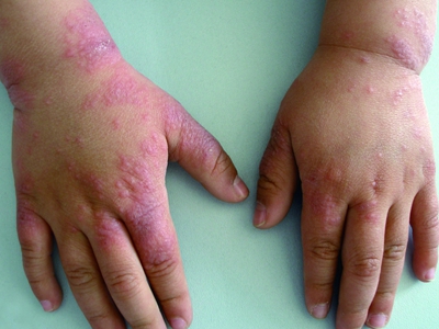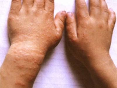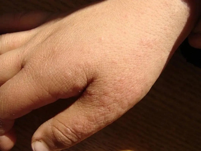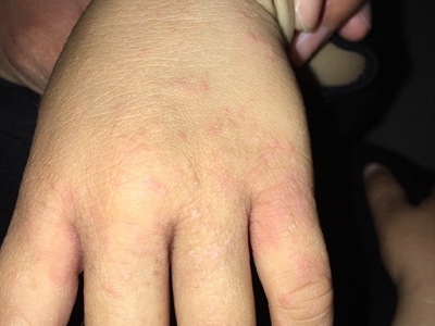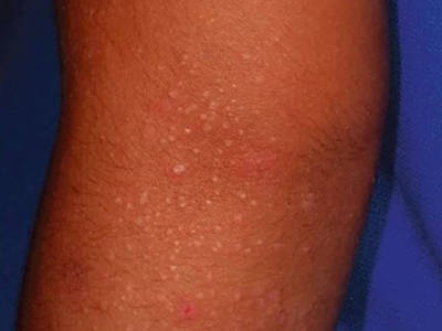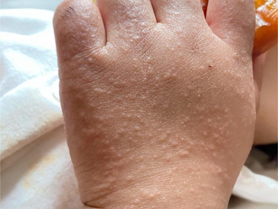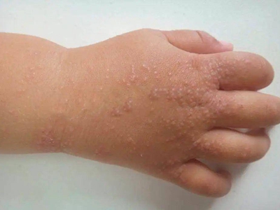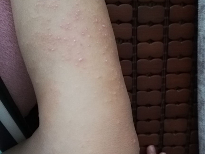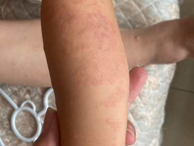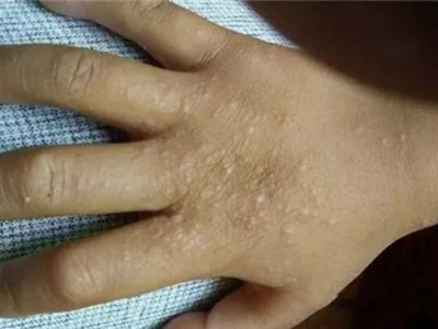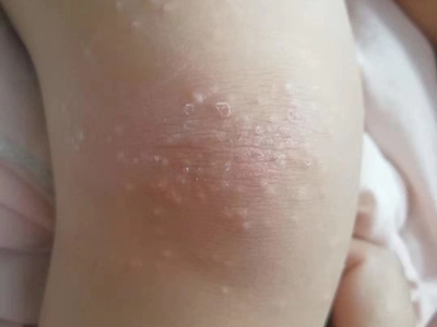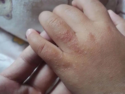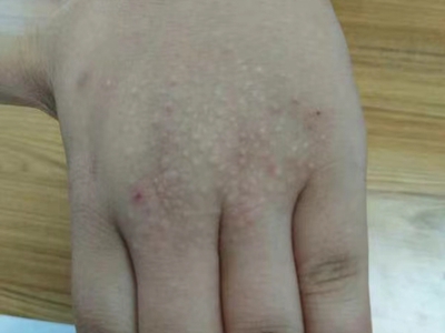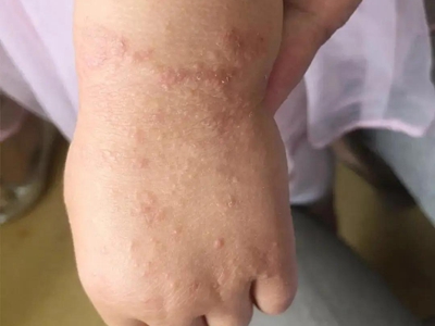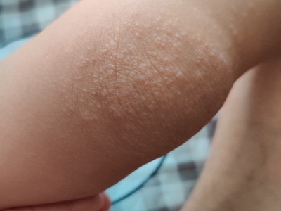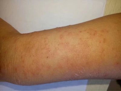 摩擦性苔癣样疹表现为胳膊上聚集分布的红色小疹子,疹子密集成群但不融合,后期疹子逐渐消退,呈轻度苔藓样变,同时自觉瘙痒,无疼痛。
